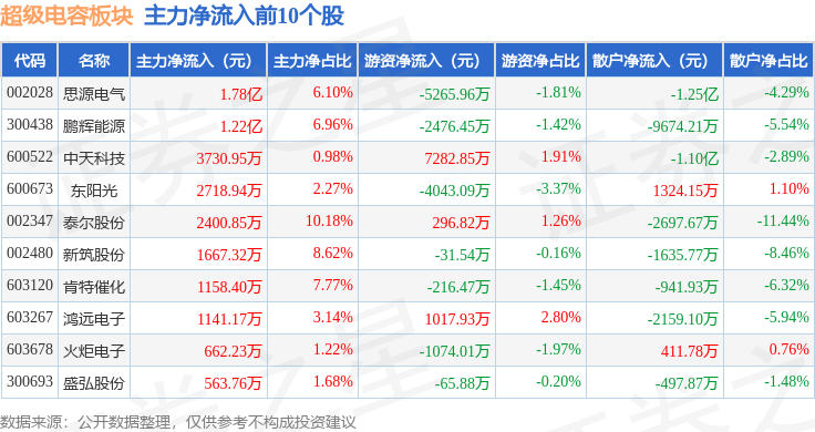 从资金流向上来看,当日超级电容板块主力资金净流出8.45亿元,游资资金净流入4.1亿元,散户资金净流入4.35亿元。超级电容板块个股资金流向见下表: