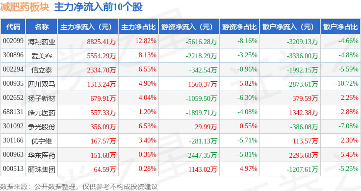 从资金流向上来看,当日减肥药板块主力资金净流出10.7亿元,游资资金净流入3.1亿元,散户资金净流入7.6亿元。减肥药板块个股资金流向见下表: