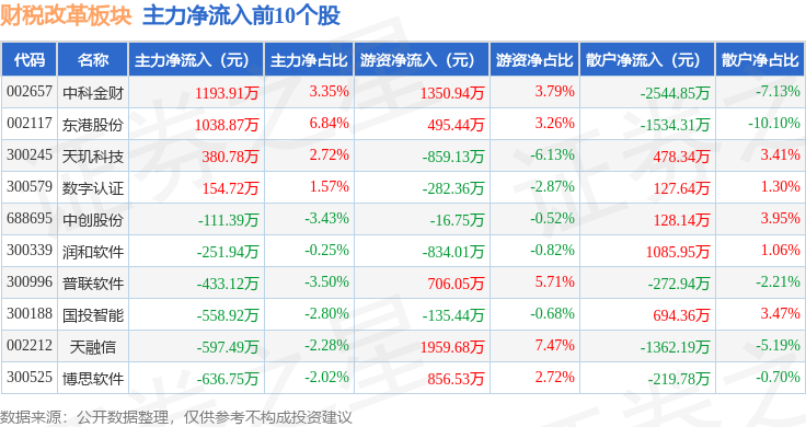 从资金流向上来看,当日财税改革板块主力资金净流出6.18亿元,游资资金净流入1.89亿元,散户资金净流入4.29亿元。财税改革板块个股资金流向见下表: