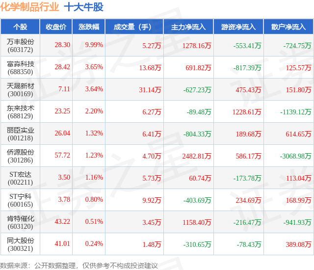 个股表现方面,化学制品行业当日领涨股为万丰股份(603172),该股当日报收28.3,上涨9.99%,成交量5.27万,主力资金净流入1278.16万元。富淼科技(688350)以上涨3.65%紧随其后,该股当日成交量13.68万,主力资金净流入691.82万元。除此之外,天晟新材(300169)、东来技术(688129)、丽臣实业(001218)均进入当日牛股之列。具体个股列表见下表: