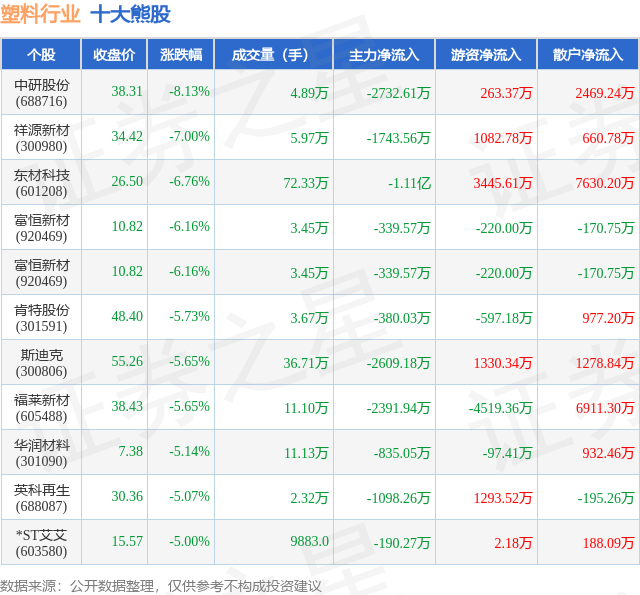 个股表现方面,塑料行业当日领跌股为中研股份(688716),该股当日报收38.31,下跌8.13%,成交量4.89万,主力资金净流出2732.61万元。祥源新材(300980)以下跌7.0%紧随其后,该股当日成交量5.97万,主力资金净流出1743.56万元。除此之外,东材科技(601208)、富恒新材(920469)、富恒新材(920469)均进入当日熊股之列。具体个股列表见下表: