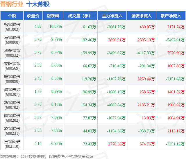 个股表现方面,普钢行业当日领跌股为柳钢股份(601003),该股当日报收4.82,下跌10.07%,成交量61.63万,主力资金净流出2601.79万元。马钢股份(600808)以下跌9.79%紧随其后,该股当日成交量192.46万,主力资金净流入2896.91万元。除此之外,华菱钢铁(000932)、安阳钢铁(600569)、鞍钢股份(000898)均进入当日熊股之列。具体个股列表见下表: