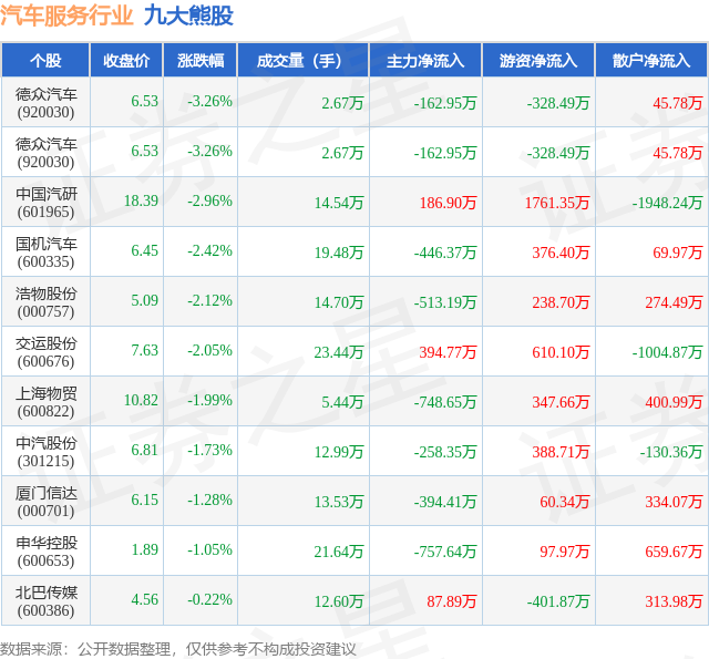 个股表现方面,汽车服务行业当日领跌股为德众汽车(920030),该股当日报收6.53,下跌3.26%,成交量2.67万,主力资金净流出162.95万元。德众汽车(920030)以下跌3.26%紧随其后,该股当日成交量2.67万,主力资金净流出162.95万元。除此之外,中国汽研(601965)、国机汽车(600335)、浩物股份(000757)均进入当日熊股之列。具体个股列表见下表: