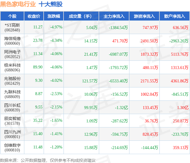 个股表现方面,黑色家电行业当日领跌股为*ST高斯(002848),该股当日报收11.27,下跌4.97%,成交量5.04万,主力资金净流出1384.54万元。海信视像(600060)以下跌4.34%紧随其后,该股当日成交量14.15万,主力资金净流入471.7万元。除此之外,同洲电子(002052)、极米科技(688696)、兆驰股份(002429)均进入当日熊股之列。具体个股列表见下表:
