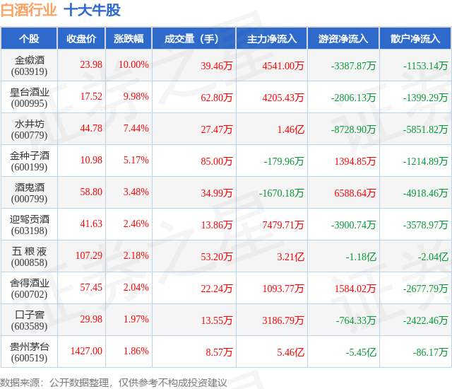 个股表现方面,白酒行业当日领涨股为金徽酒(603919),该股当日报收23.98,上涨10.0%,成交量39.46万,主力资金净流入4541.0万元。皇台酒业(000995)以上涨9.98%紧随其后,该股当日成交量62.8万,主力资金净流入4205.43万元。除此之外,水井坊(600779)、金种子酒(600199)、酒鬼酒(000799)均进入当日牛股之列。具体个股列表见下表: