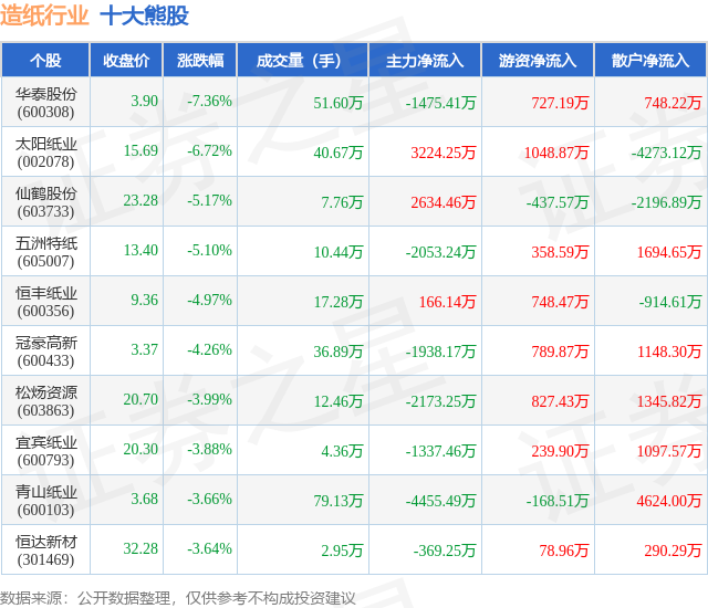 个股表现方面,造纸行业当日领跌股为华泰股份(600308),该股当日报收3.9,下跌7.36%,成交量51.6万,主力资金净流出1475.41万元。太阳纸业(002078)以下跌6.72%紧随其后,该股当日成交量40.67万,主力资金净流入3224.25万元。除此之外,仙鹤股份(603733)、五洲特纸(605007)、恒丰纸业(600356)均进入当日熊股之列。具体个股列表见下表: