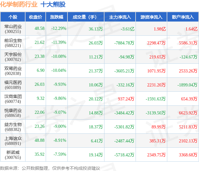 个股表现方面,化学制药行业当日领跌股为常山药业(300255),该股当日报收48.58,下跌12.29%,成交量36.13万,主力资金净流出3.61亿元。前沿生物(688221)以下跌11.39%紧随其后,该股当日成交量26.03万,主力资金净流出7884.78万元。除此之外,天宇股份(300702)、双鹭药业(002038)、福元医药(601089)均进入当日熊股之列。具体个股列表见下表: