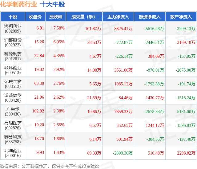 个股表现方面,化学制药行业当日领涨股为海翔药业(002099),该股当日报收6.81,上涨7.58%,成交量101.87万,主力资金净流入8825.41万元。润都股份(002923)以上涨6.05%紧随其后,该股当日成交量28.53万,主力资金净流出722.87万元。除此之外,科源制药(301281)、联环药业(600513)、苑东生物(688513)均进入当日牛股之列。具体个股列表见下表: