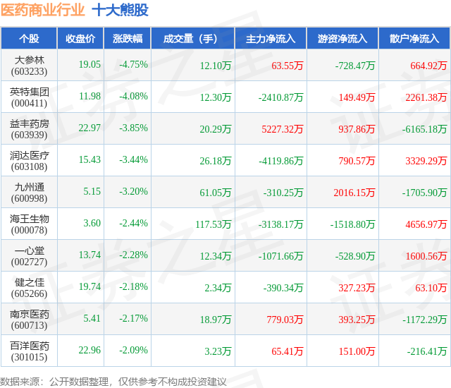 个股表现方面,医药商业行业当日领跌股为大参林(603233),该股当日报收19.05,下跌4.75%,成交量12.1万,主力资金净流入63.55万元。英特集团(000411)以下跌4.08%紧随其后,该股当日成交量12.3万,主力资金净流出2410.87万元。除此之外,益丰药房(603939)、润达医疗(603108)、九州通(600998)均进入当日熊股之列。具体个股列表见下表: