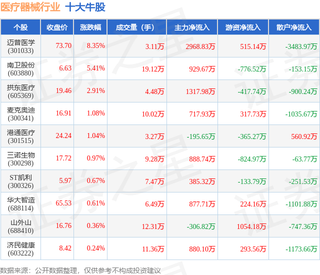 个股表现方面,医疗器械行业当日领涨股为迈普医学(301033),该股当日报收73.7,上涨8.35%,成交量3.11万,主力资金净流入2968.83万元。南卫股份(603880)以上涨5.41%紧随其后,该股当日成交量19.12万,主力资金净流入929.67万元。除此之外,拱东医疗(605369)、麦克奥迪(300341)、港通医疗(301515)均进入当日牛股之列。具体个股列表见下表: