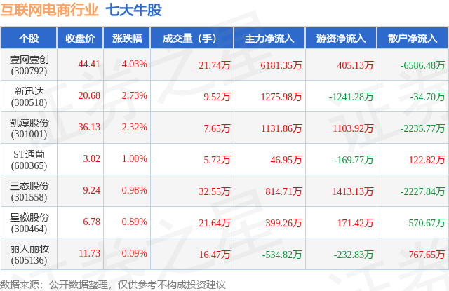 个股表现方面,互联网电商行业当日领涨股为壹网壹创(300792),该股当日报收44.41,上涨4.03%,成交量21.74万,主力资金净流入6181.35万元。新迅达(300518)以上涨2.73%紧随其后,该股当日成交量9.52万,主力资金净流入1275.98万元。除此之外,凯淳股份(301001)、ST通葡(600365)、三态股份(301558)均进入当日牛股之列。具体个股列表见下表: