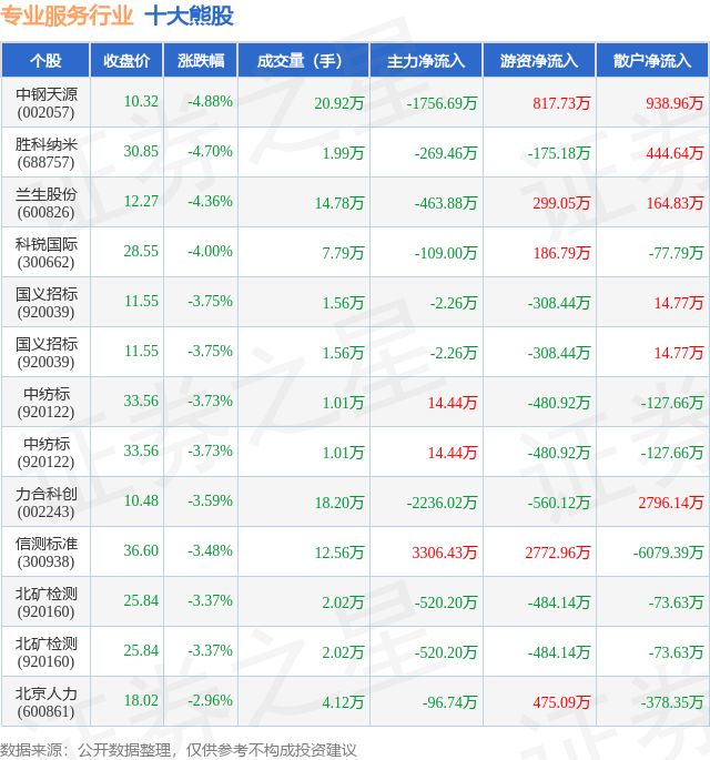 个股表现方面,专业服务行业当日领跌股为中钢天源(002057),该股当日报收10.32,下跌4.88%,成交量20.92万,主力资金净流出1756.69万元。胜科纳米(688757)以下跌4.7%紧随其后,该股当日成交量1.99万,主力资金净流出269.46万元。除此之外,兰生股份(600826)、科锐国际(300662)、国义招标(920039)均进入当日熊股之列。具体个股列表见下表: