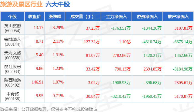 个股表现方面,旅游及景区行业当日领涨股为黄山旅游(600054),该股当日报收13.17,上涨3.29%,成交量37.25万,主力资金净流出1763.51万元。宋城演艺(300144)以上涨2.11%紧随其后,该股当日成交量127.32万,主力资金净流入1.1亿元。除此之外,天府文旅(000558)、丽江股份(002033)、陕西旅游(603402)均进入当日牛股之列。具体个股列表见下表: