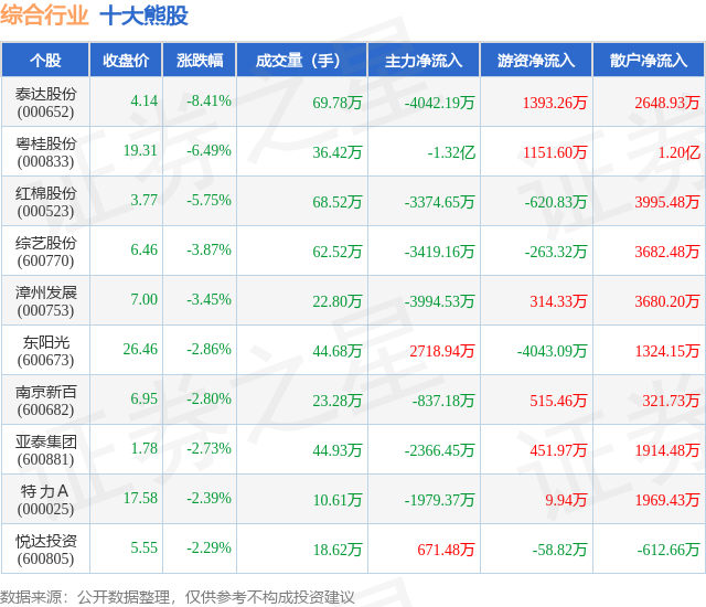 个股表现方面,综合行业当日领跌股为泰达股份(000652),该股当日报收4.14,下跌8.41%,成交量69.78万,主力资金净流出4042.19万元。粤桂股份(000833)以下跌6.49%紧随其后,该股当日成交量36.42万,主力资金净流出1.32亿元。除此之外,红棉股份(000523)、综艺股份(600770)、漳州发展(000753)均进入当日熊股之列。具体个股列表见下表: