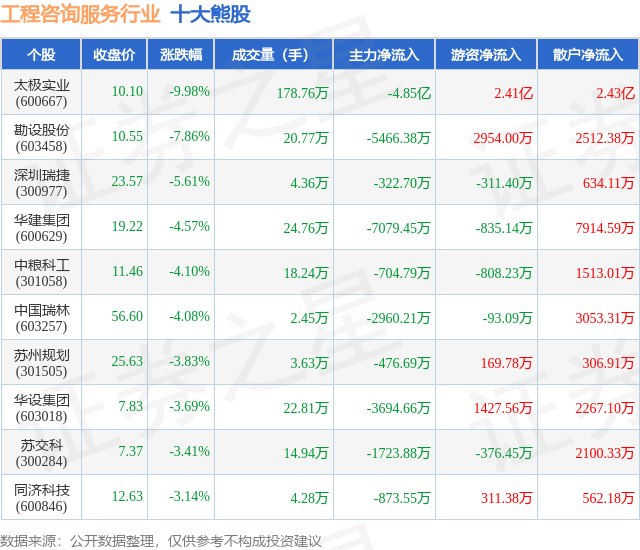 个股表现方面,工程咨询服务行业当日领跌股为太极实业(600667),该股当日报收10.1,下跌9.98%,成交量178.76万,主力资金净流出4.85亿元。勘设股份(603458)以下跌7.86%紧随其后,该股当日成交量20.77万,主力资金净流出5466.38万元。除此之外,深圳瑞捷(300977)、华建集团(600629)、中粮科工(301058)均进入当日熊股之列。具体个股列表见下表: