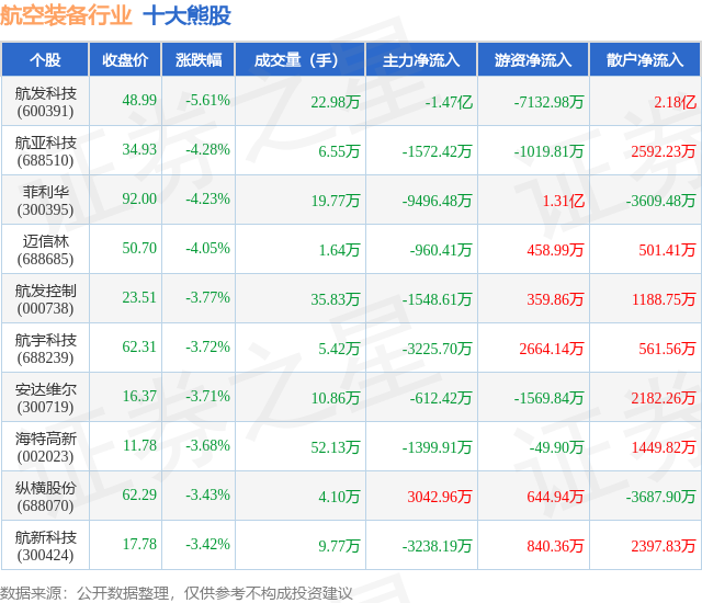 个股表现方面,航空装备行业当日领跌股为航发科技(600391),该股当日报收48.99,下跌5.61%,成交量22.98万,主力资金净流出1.47亿元。航亚科技(688510)以下跌4.28%紧随其后,该股当日成交量6.55万,主力资金净流出1572.42万元。除此之外,菲利华(300395)、迈信林(688685)、航发控制(000738)均进入当日熊股之列。具体个股列表见下表: