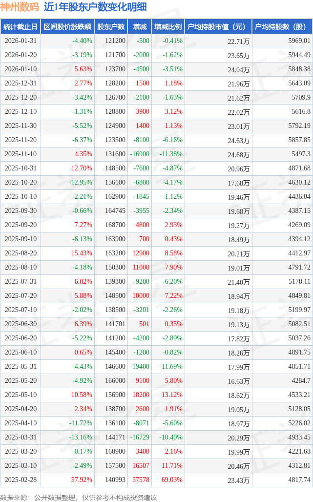 从股价来看,2026年1月20日至2026年1月31日,神州数码区间跌幅为4.4%,在此期间股东户数减少500.0户,减幅为0.41%。