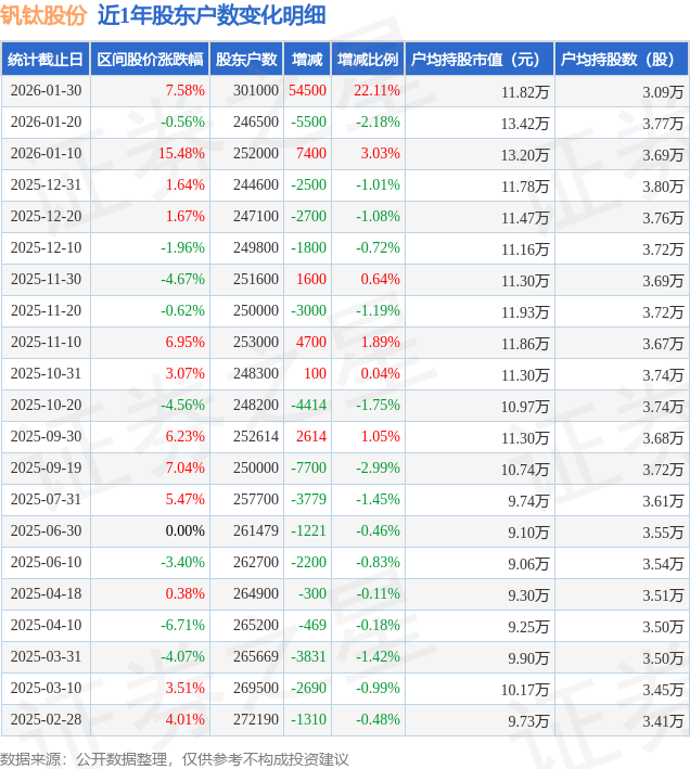 证券之星消息,近日钒钛股份披露,截至2026年1月30日公司股东户数为30.1万户,较1月20日增加5.45万户,增幅为22.11%。户均持股数量由上期的3.77万股减少至3.09万股,户均持股市值为11.82万元。