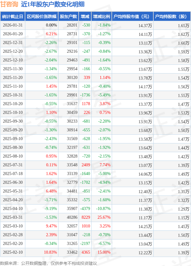 从股价来看,2026年1月20日至2026年1月31日,甘咨询区间跌幅为0.0%,在此期间股东户数减少530.0户,减幅为1.84%。