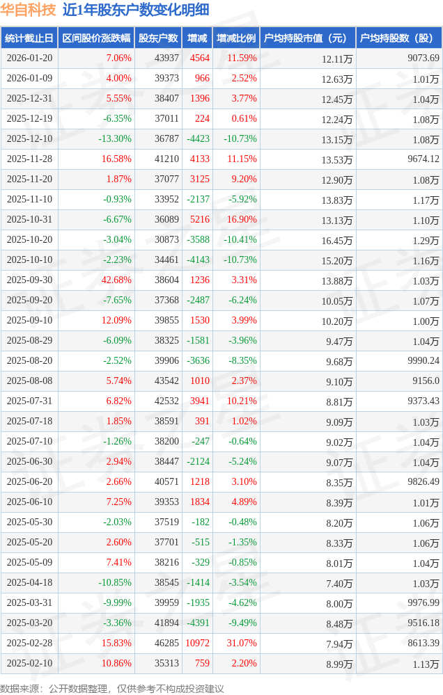 从股价来看,2026年1月9日至2026年1月20日,华自科技区间涨幅为7.06%,在此期间股东户数增加4564.0户,增幅为11.59%。