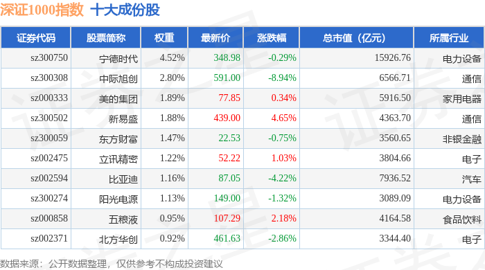 深证1000(399011)指数十大成份股详情如下: