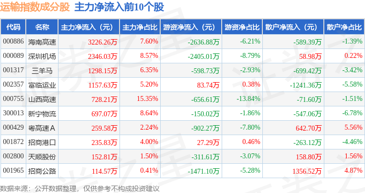 资金流向方面,运输指数(399237)成份股当日主力资金净流出合计1.87亿元,游资资金净流入合计2420.69万元,散户资金净流入合计1.62亿元。成份股资金流向详情见下表: