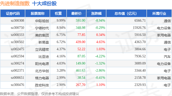 证券之星消息,2月2日,先进制造(399260)指数报收于3734.45点,跌1.76%,成交2206.56亿元,换手率1.7%。当日该指数成份股中,上涨的有12家,新易盛以4.65%的涨幅领涨,下跌的有38家,卫星化学以10.02%的跌幅领跌。