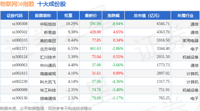 证券之星消息,2月2日,物联网50(399285)指数报收于6628.01点,跌2.68%,成交1850.11亿元,换手率3.87%。当日该指数成份股中,上涨的有9家,新易盛以4.65%的涨幅领涨,下跌的有41家,北京君正以11.06%的跌幅领跌。