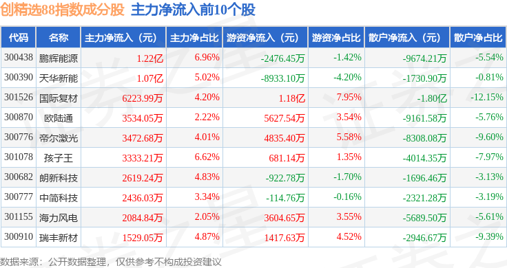 资金流向方面,创精选88(399291)指数成份股当日主力资金净流出合计20.95亿元,游资资金净流入合计9.25亿元,散户资金净流入合计11.7亿元。成份股资金流向详情见下表: