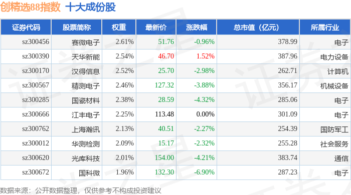 创精选88(399291)指数十大成份股详情如下:
