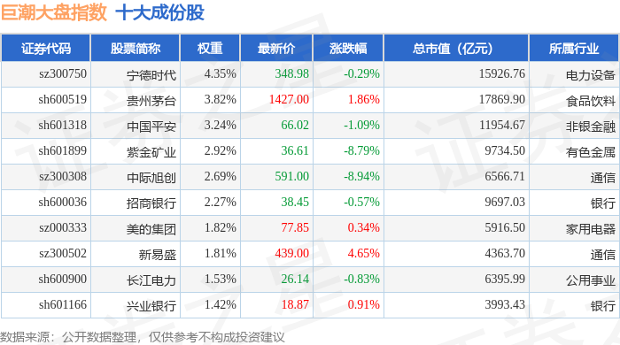 证券之星消息,2月2日,巨潮大盘(399314)指数报收于5057.71点,跌1.91%,成交5853.23亿元,换手率0.83%。当日该指数成份股中,上涨的有49家,新易盛以4.65%的涨幅领涨,下跌的有149家,兆易创新以10.0%的跌幅领跌。