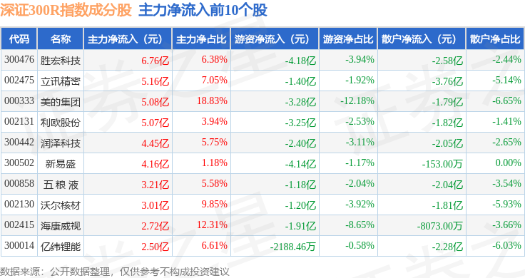 资金流向方面,深证300R(399344)指数成份股当日主力资金净流出合计243.02亿元,游资资金净流入合计85.77亿元,散户资金净流入合计157.25亿元。成份股资金流向详情见下表: