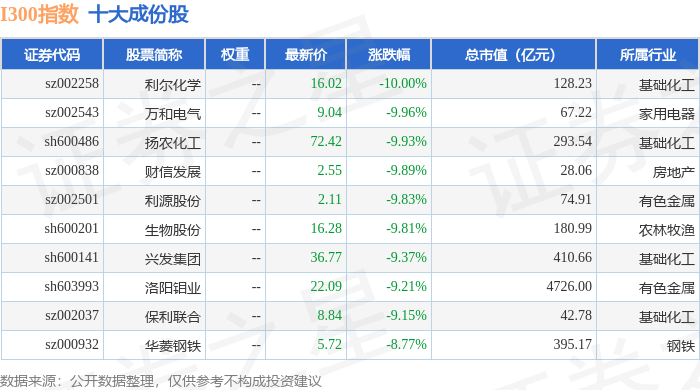 证券之星消息,2月2日,I300(399416)指数报收于5289.55点,跌3.2%,成交780.64亿元,换手率0.29%。当日该指数成份股中,上涨的有46家,黄河旋风以10.08%的涨幅领涨,下跌的有233家,利尔化学以10.0%的跌幅领跌。