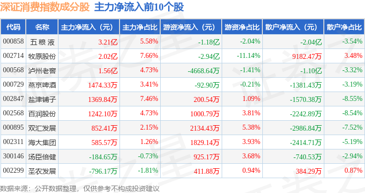 资金流向方面,深证消费(399617)指数成份股当日主力资金净流入合计4.07亿元,游资资金净流出合计2.66亿元,散户资金净流出合计1.41亿元。成份股资金流向详情见下表:
