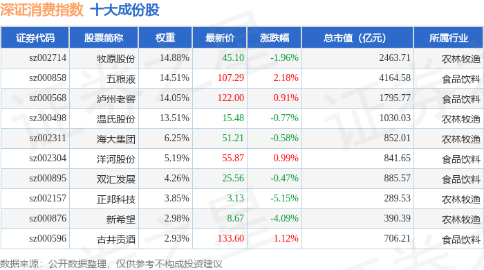 深证消费(399617)指数十大成份股详情如下: