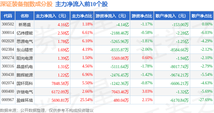 资金流向方面,深证装备(399636)指数成份股当日主力资金净流出合计80.88亿元,游资资金净流入合计54.58亿元,散户资金净流入合计26.3亿元。成份股资金流向详情见下表: