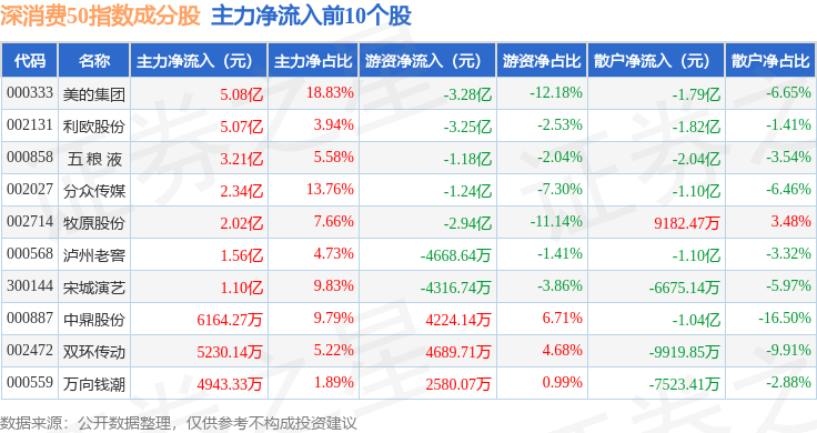 资金流向方面,深消费50(399646)指数成份股当日主力资金净流出合计27.99亿元,游资资金净流入合计7.61亿元,散户资金净流入合计20.38亿元。成份股资金流向详情见下表: