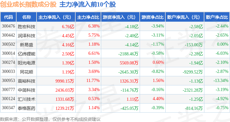 资金流向方面,创业成长(399667)指数成份股当日主力资金净流出合计84.25亿元,游资资金净流入合计52.14亿元,散户资金净流入合计32.11亿元。成份股资金流向详情见下表: