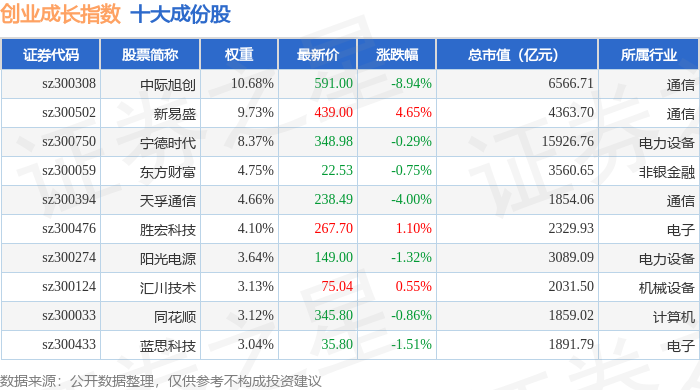 创业成长(399667)指数十大成份股详情如下:
