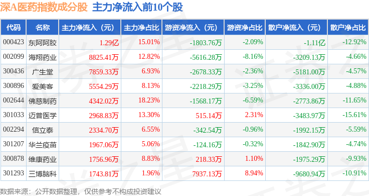 资金流向方面,深A医药(399674)指数成份股当日主力资金净流出合计22.59亿元,游资资金净流入合计8.93亿元,散户资金净流入合计13.66亿元。成份股资金流向详情见下表: