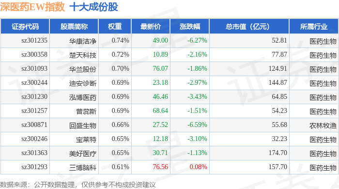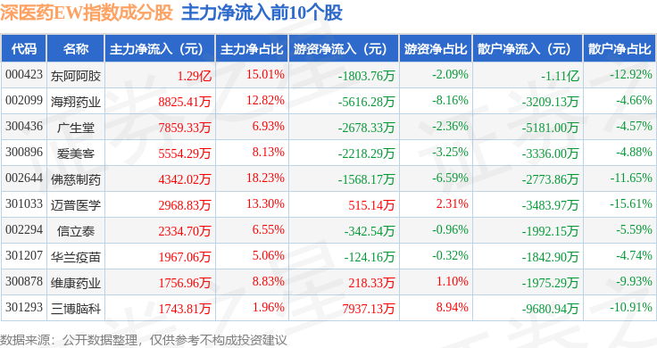 资金流向方面,深医药EW(399676)指数成份股当日主力资金净流出合计22.59亿元,游资资金净流入合计8.93亿元,散户资金净流入合计13.66亿元。成份股资金流向详情见下表: