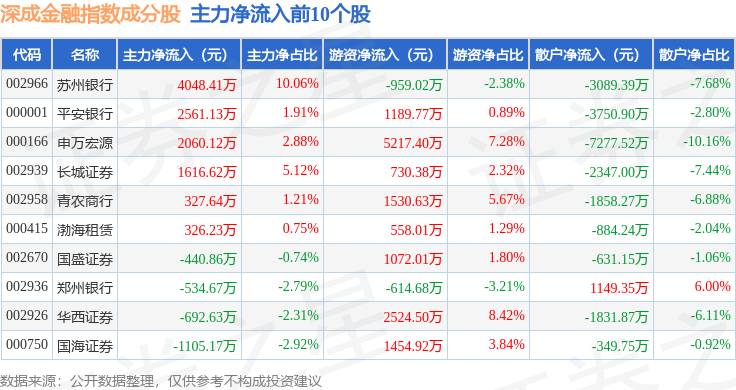 资金流向方面,深成金融(399686)指数成份股当日主力资金净流出合计13.5亿元,游资资金净流入合计7.4亿元,散户资金净流入合计6.11亿元。成份股资金流向详情见下表: