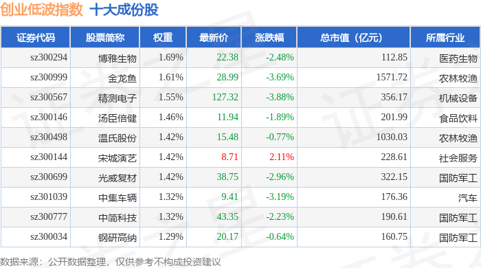创业低波(399692)指数十大成份股详情如下: