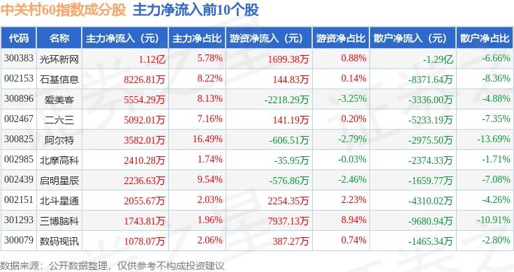 资金流向方面,中关村60(399697)指数成份股当日主力资金净流出合计53.04亿元,游资资金净流入合计15.57亿元,散户资金净流入合计37.46亿元。成份股资金流向详情见下表: