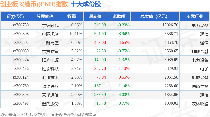 创业板R(港币)(CNH)(470006)指数十大成份股详情如下: