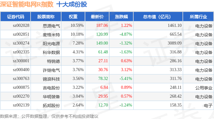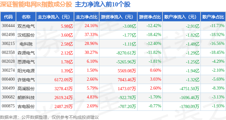资金流向方面,深证智能电网R(470054)指数成份股当日主力资金净流入合计11.46亿元,游资资金净流出合计3.87亿元,散户资金净流出合计7.59亿元。成份股资金流向详情见下表: