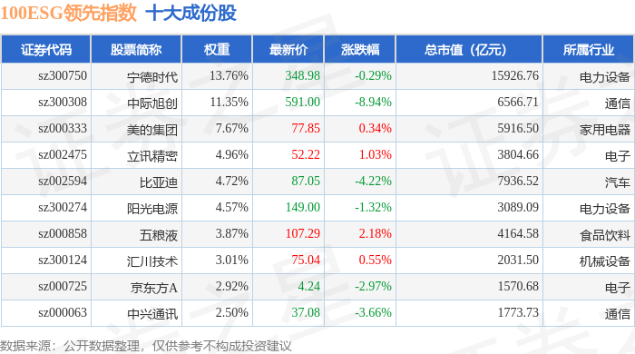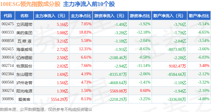 资金流向方面,100ESG领先(970030)指数成份股当日主力资金净流出合计71.39亿元,游资资金净流入合计45.78亿元,散户资金净流入合计25.61亿元。成份股资金流向详情见下表: