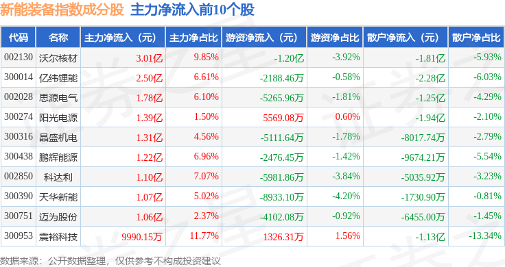 资金流向方面,新能装备(970043)指数成份股当日主力资金净流出合计15.4亿元,游资资金净流入合计7.24亿元,散户资金净流入合计8.17亿元。成份股资金流向详情见下表: