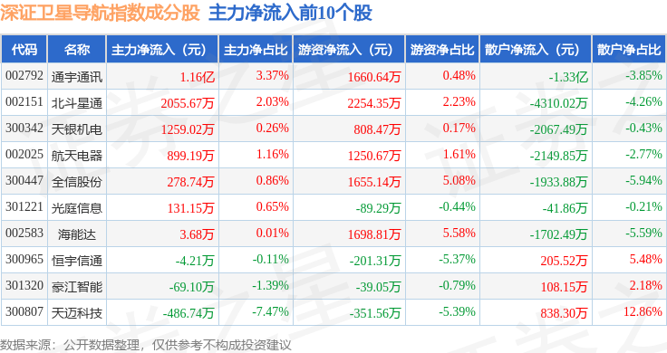 资金流向方面,深证卫星导航(970050)指数成份股当日主力资金净流出合计22.41亿元,游资资金净流入合计8.94亿元,散户资金净流入合计13.47亿元。成份股资金流向详情见下表: