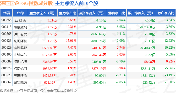 资金流向方面,深证国企ESG(970055)指数成份股当日主力资金净流出合计25.87亿元,游资资金净流入合计7.58亿元,散户资金净流入合计18.28亿元。成份股资金流向详情见下表: